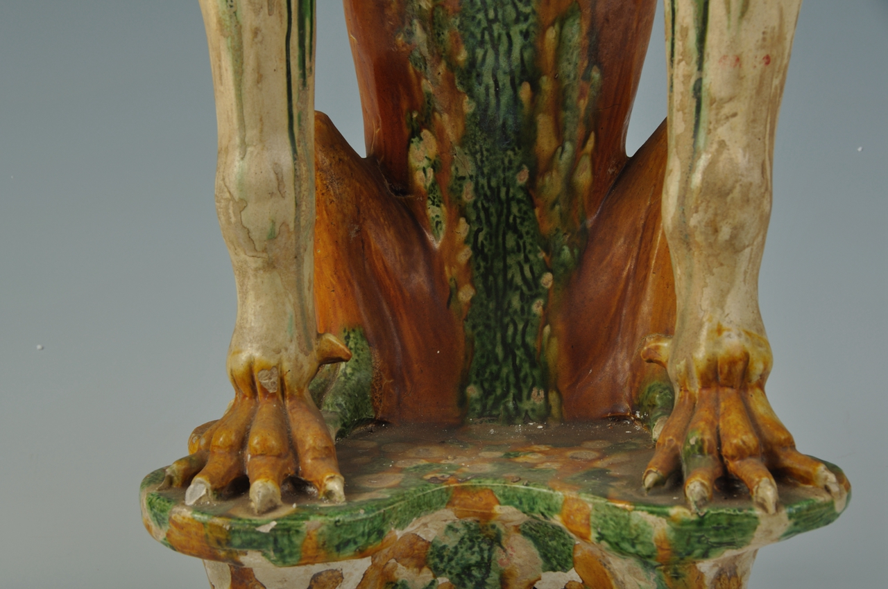 胎呈褐色,质较松。兽头生角,大耳竖立,双目圆鼓,张口露齿,面目狰狞可怖。双肩生翼,昂首挺胸,前肢直撑,后肢弯曲,蹲坐不规则圆形台座上。周身施绿、黄、赭色釉彩。