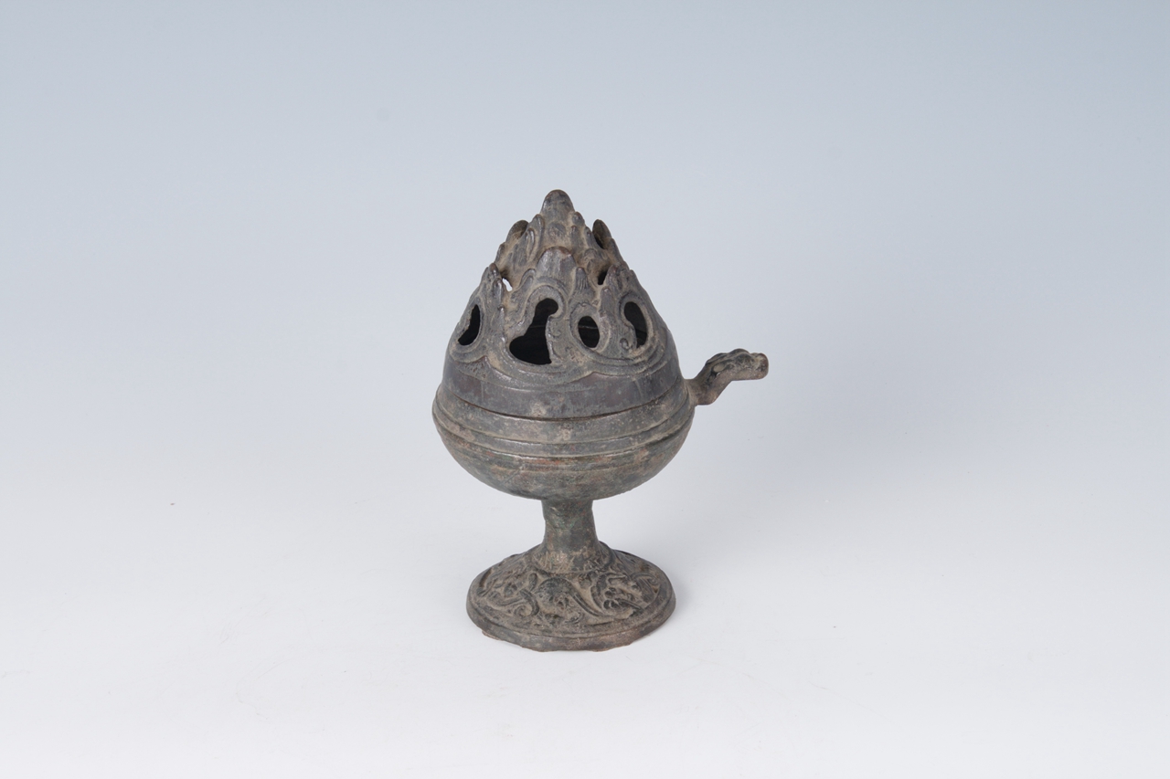 炉体带兽柄,呈半球形。上有镂空的山形盖,圆盘花草纹底座。中有圆柱形柄与炉体相接。