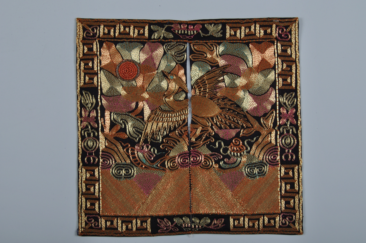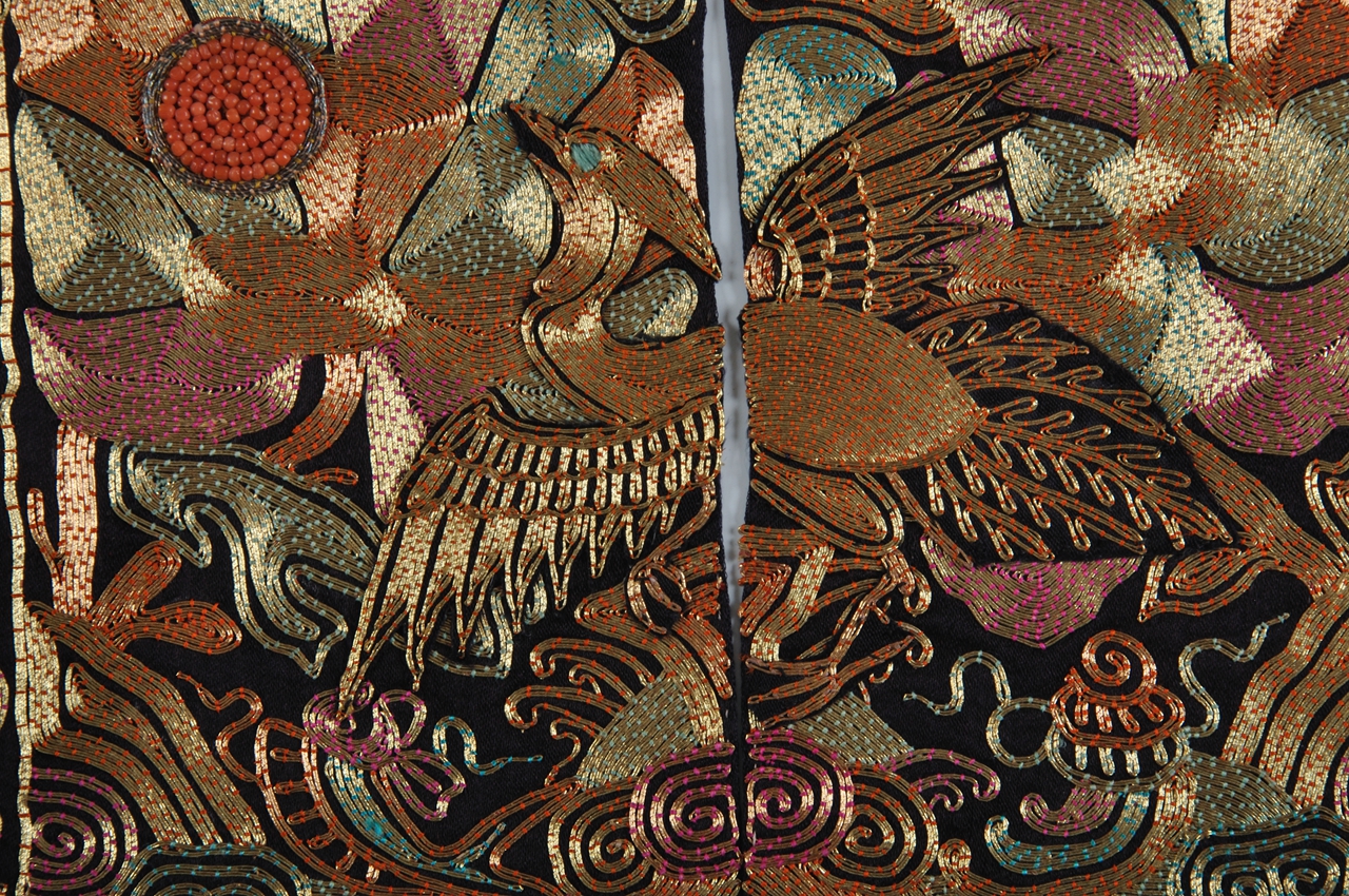 前补,方形,回纹及盆花边饰,黑缎地,中上部平金绣,有一向着太阳展翅飞翔的凤凰,太阳由珊瑚珠串成,以花卉、云纹、海水等纹饰相辅,中间断开成两片,露出蓝绸里;后补,方形,针法及花纹图案同前补。