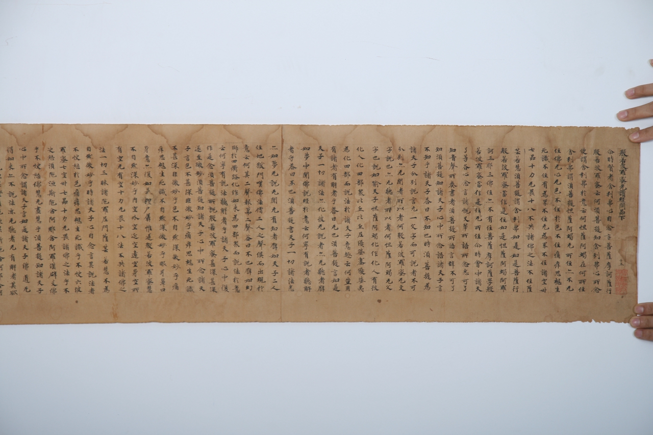 在我馆馆藏书画文物中藏有23件经卷卷轴和残片,历年来一直作为珍贵古代书法作品来保管,并没有认识到其作为敦煌遗书的价值所在。通过第一次可移动文物普查,经专家考证,认定此经卷藏品为敦煌遗书,这是我馆在此次文物普查中的重大发现之一,在山东省是继省博物馆、省图书馆之后又发现藏有敦煌遗书的单位,也是青岛市的首次发现,意义重大,提升了该藏品的历史价值和文献价值。