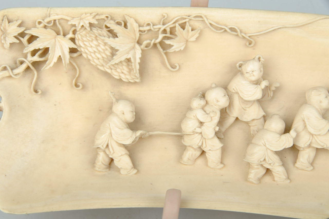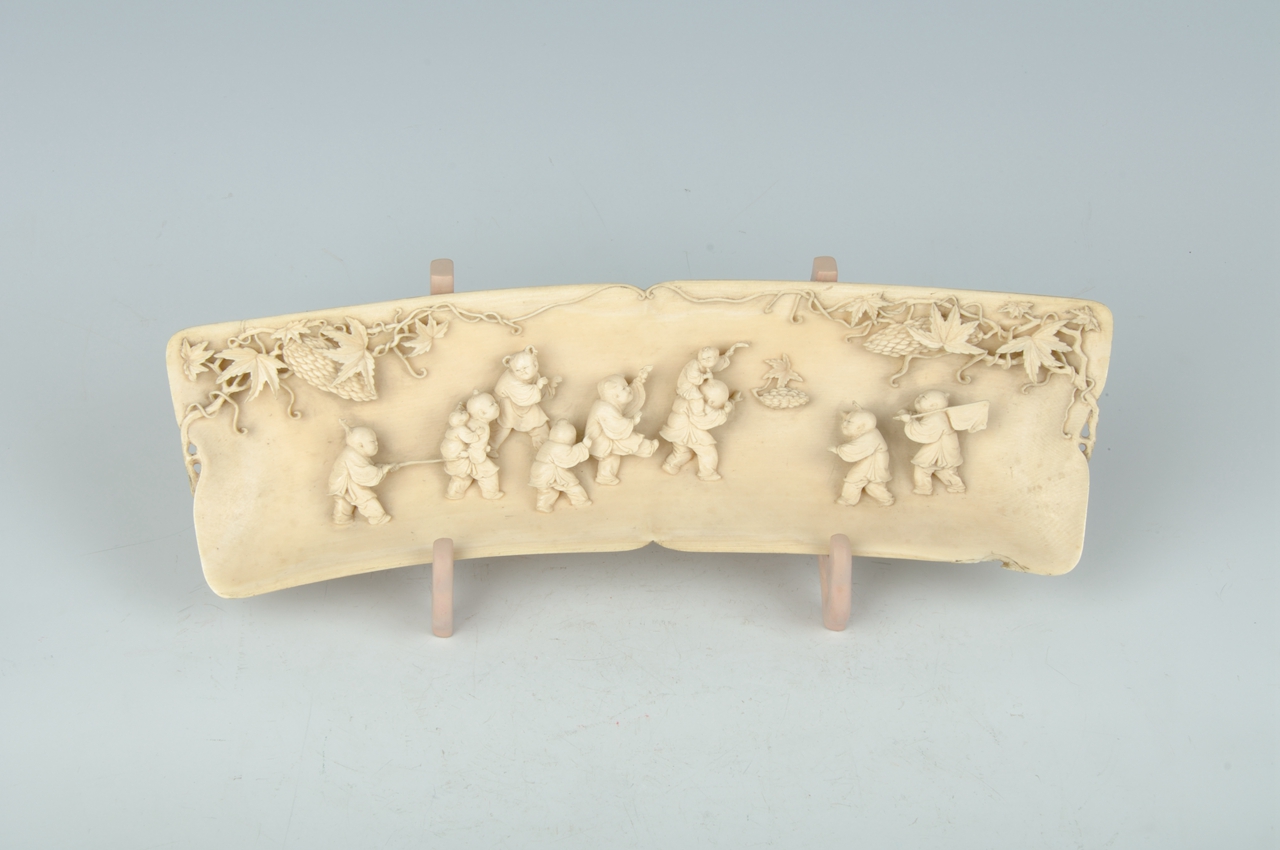 以象牙为材,采用浮雕、透雕等技法随形雕刻。插片两端上部雕有两株癞葡萄,茎叶繁密、缠绕延伸,富有生气。癞葡萄架下一群婴孩在嬉闹,共雕有大、小孩童十个,圆头、圆脸,或扛旗,或执棍,或大童背小童,姿态各异、活泼可爱。整器雕工精湛、画面生动。