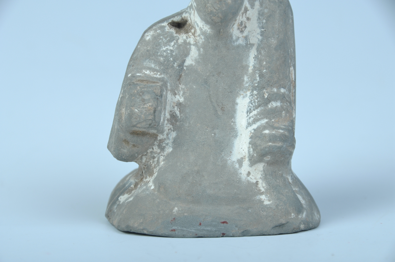 泥质灰陶,模制,中间有一道合模线,外饰白色化妆土,佣呈坐状,头戴纀巾,左肩高,右肩低,左手扶膝,右手向前抬起。