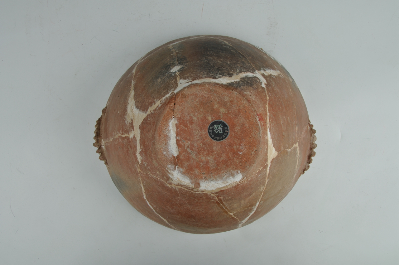 1979年青岛胶州三里河出土。红陶钵,敞口,斜壁,平底,口缘外壁两侧各饰一锯齿形短耳。造型简朴。富有浓厚的地方特色。是大汶口文化的器物。