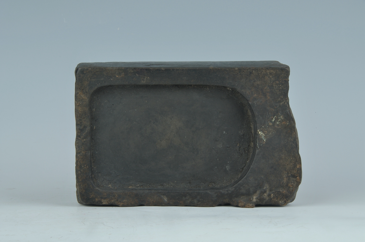 砚面凿成拱门形,砚堂上方稍凹为水池。左侧阳文“泰和三年制”,右侧磨平无纹,上侧为断面。砚阴印有绳纹,古朴浑然。