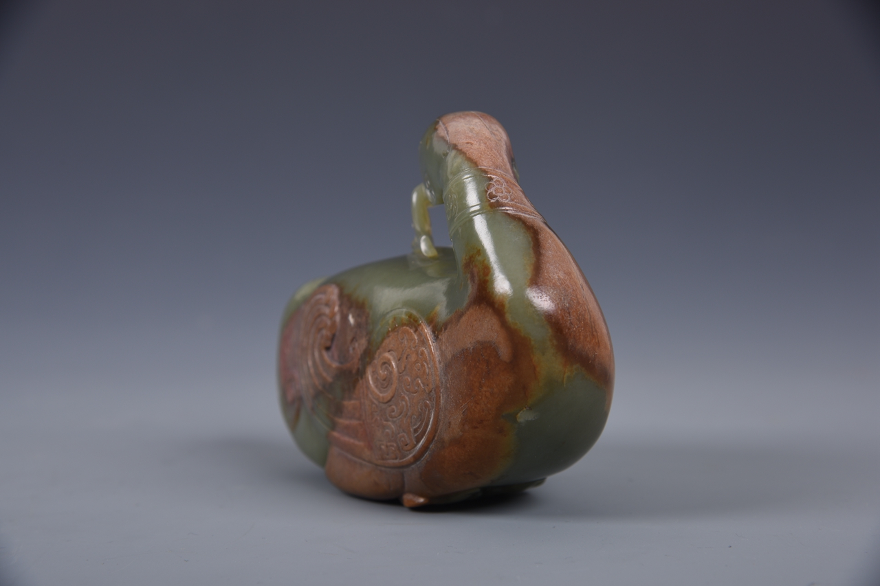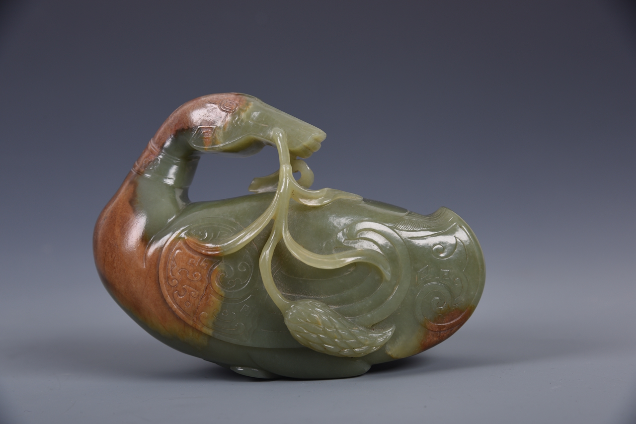 采用圆雕、透雕、阴刻等多种技法,芦雁曲颈回首,嘴衔穗禾,翅羽敛于身侧,双足隐于身下,形态圆润可爱。颌部刻云雷纹装饰,颈部为弦纹及朵花纹,双翼间刻勾连纹,颈部、尾部及一侧留有玉皮俏色,使整体造型更显古朴生动,体现了清代师古以创新的玉雕风格。