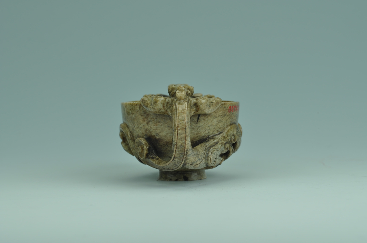 直口,弧腹,圈足。两侧镂雕对称的卷尾螭,螭首及前爪扒于口沿,后肢及卷尾贴于杯璧,充满动感和张力。杯体厚重,双螭形象饱满,雕刻刀法粗犷有力,具有元代玉器的典型特征。