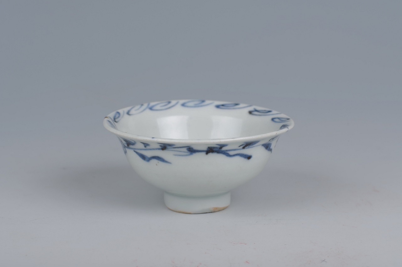 撇口,深弧壁,圈足微微外撇,底心有一小乳突。器身施白釉,以青花为装饰,釉质润泽,底足露胎,胎质致密。碗内口沿饰有一周回纹,内底心书有一文字。碗外壁绘有一周缠枝团菊纹,下笔流畅,纹饰洒脱。