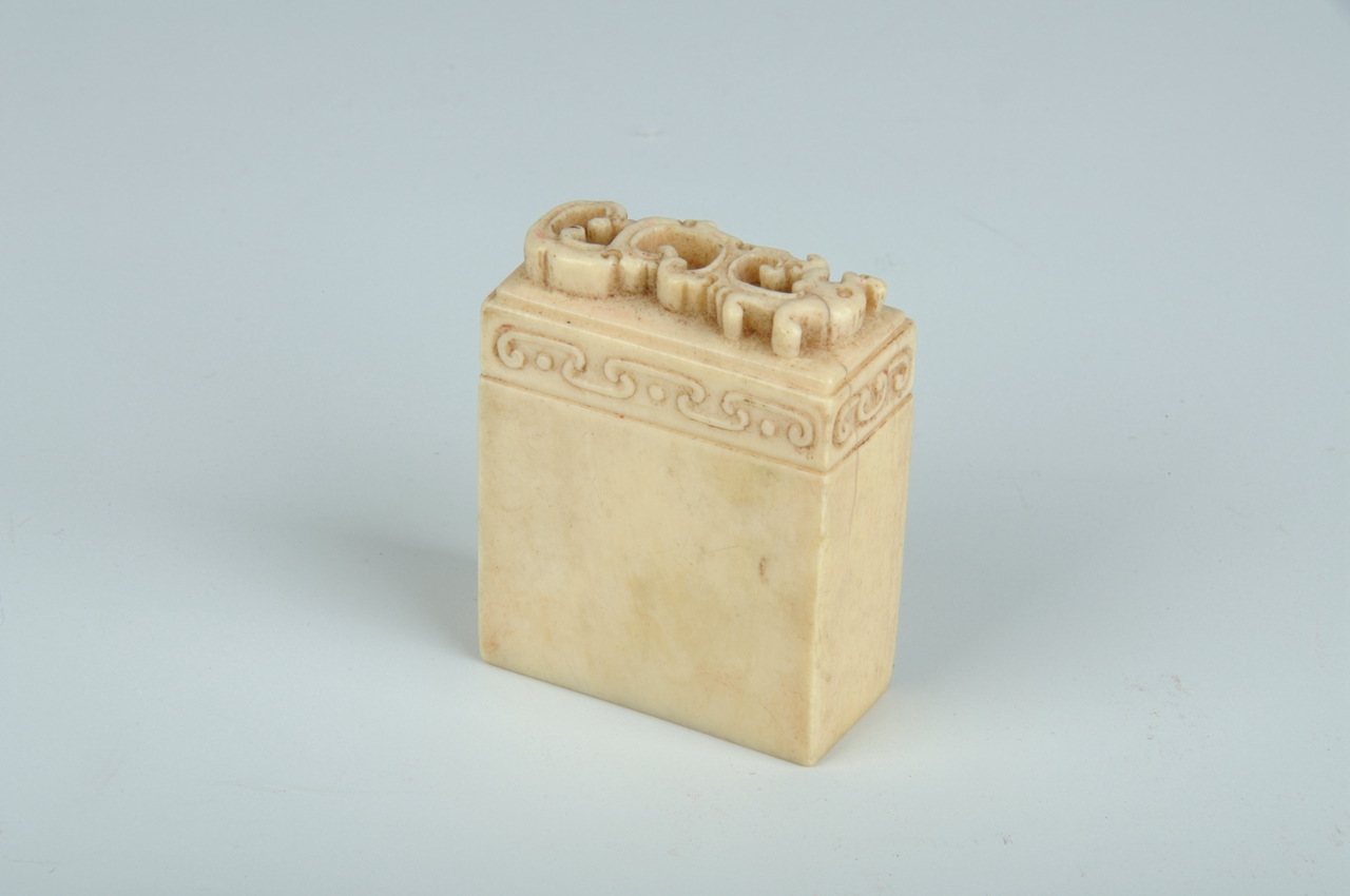 印为长方形,象牙白色,上端高浮雕饕餮鈕。印文“御赐赞元介景”朱文,印文两侧饰龙纹。
