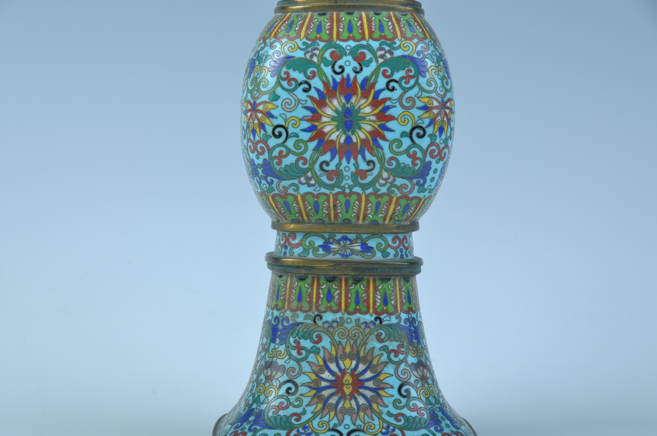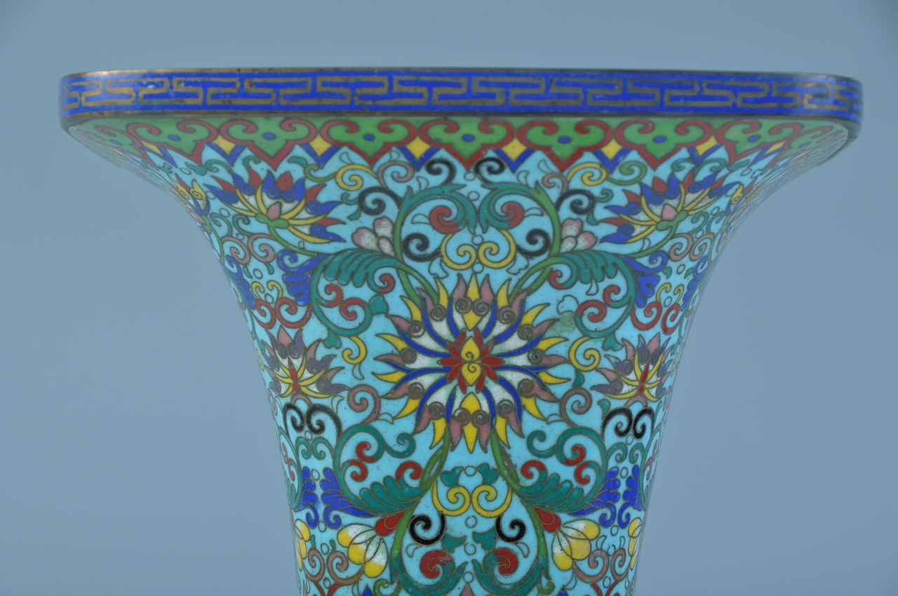 觚为铜胎镀金,仿古形制,倒喇叭形长颈,直口。通体蓝色珐琅釉上掐丝填彩西蕃莲及蕉叶纹图案,釉色纯正,掐丝规整。