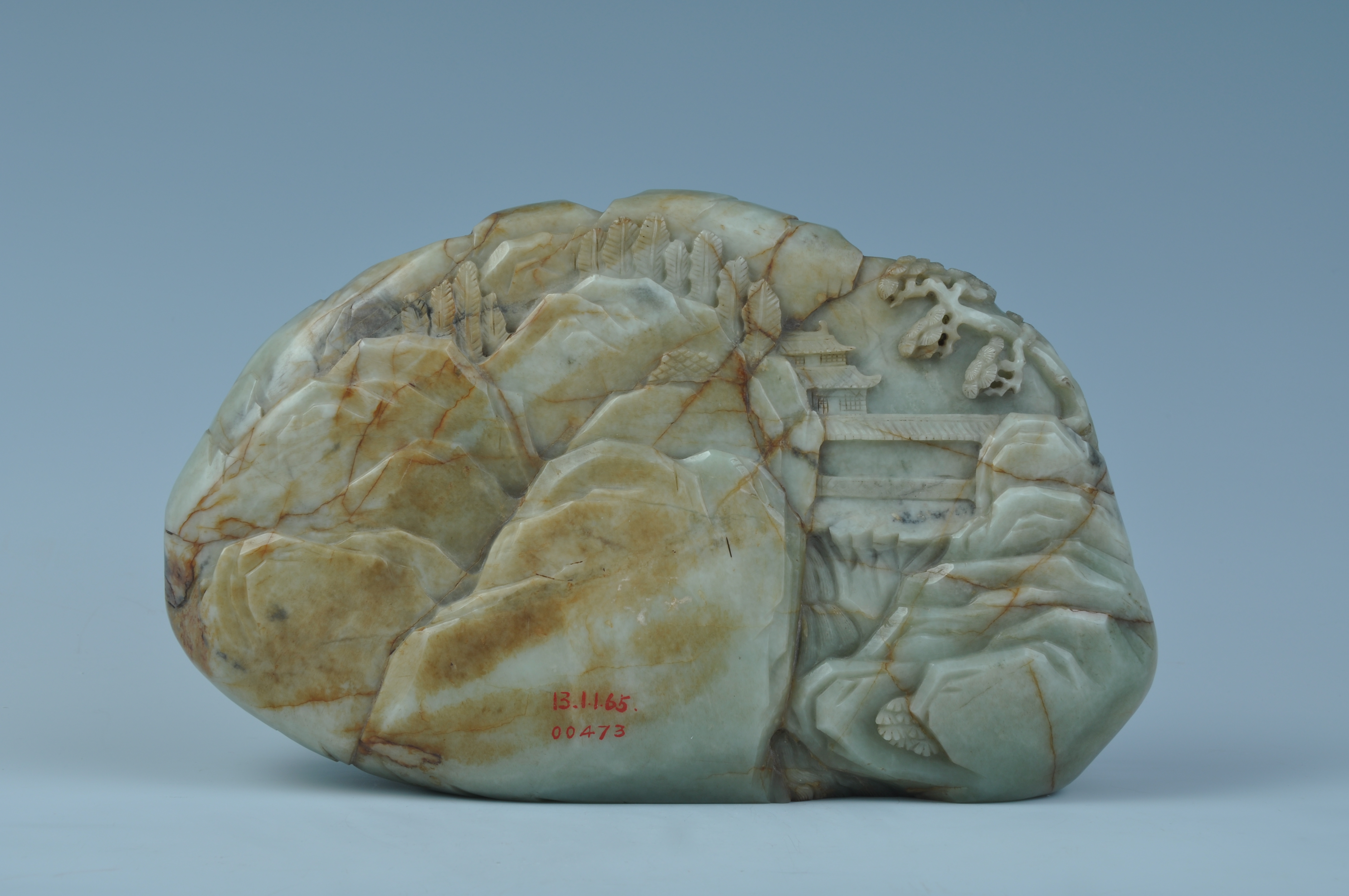 器以青玉石料自然之形巧雕为山形,玉质温润,工艺精细。正面浮雕三寿图,一侧庙宇隐现在浮云与山石之间,另侧松枫成荫,流水潺潺,三位高寿老者在桥上揖让往来,神态悠闲。背面雕刻树石楼阁,与正面相互呼应。