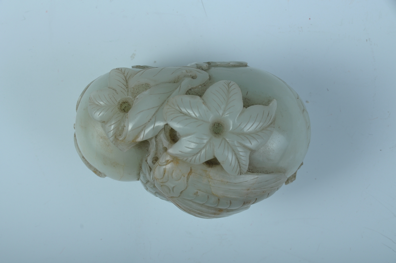 取和田籽玉为材,随形圆雕一大一小两个石榴,果实硕大浑圆。大石榴局部已裂开,露出石榴籽,顶部、底部及侧面雕刻出枝叶和果蒂,脉纹清晰,翻转有致,果蒂处浮雕一只鸣蝉。整器寓意“多子多福、一鸣惊人”。