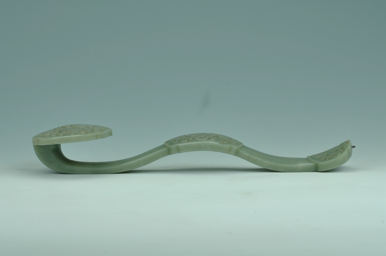 以和田青玉整料原石雕琢而成,如意首作云叶式,中间浮雕“寿”字,四周及柄中部、尾部分饰八宝纹。八宝,又称八吉祥,为藏传佛教中代表不同法力的八种物象,即白盖、莲花、金鱼、宝瓶、法螺、盘长、宝伞、法轮,是清代十分流行的具有吉祥意义的装饰纹样。整器有“吉祥长寿”的美好寓意。