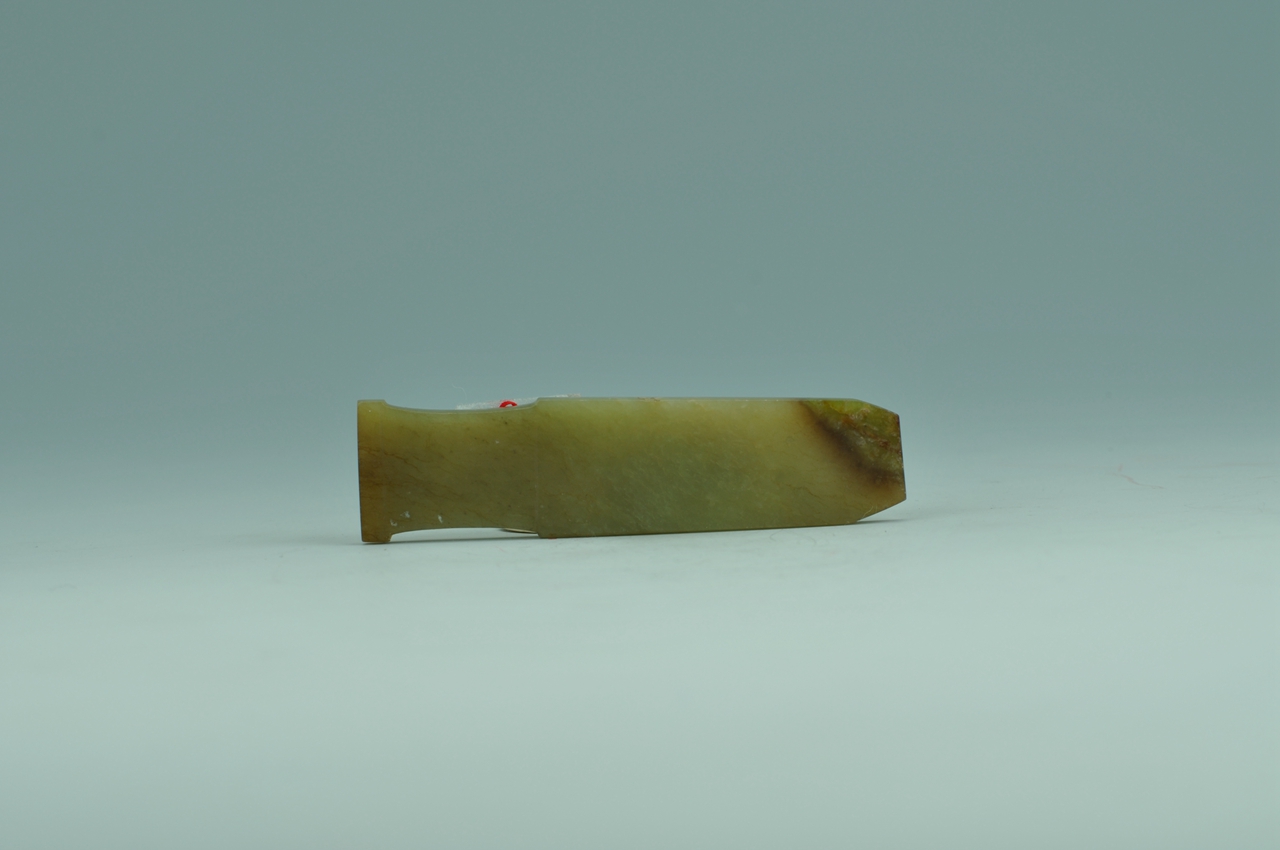 器呈片状长条形,平顶,颈部微敛如柄状,下端一宽凸榫。整体光素无纹。雕琢器形规整,厚薄均匀,打磨精细。玉质润泽,右下角有浅褐色沁。