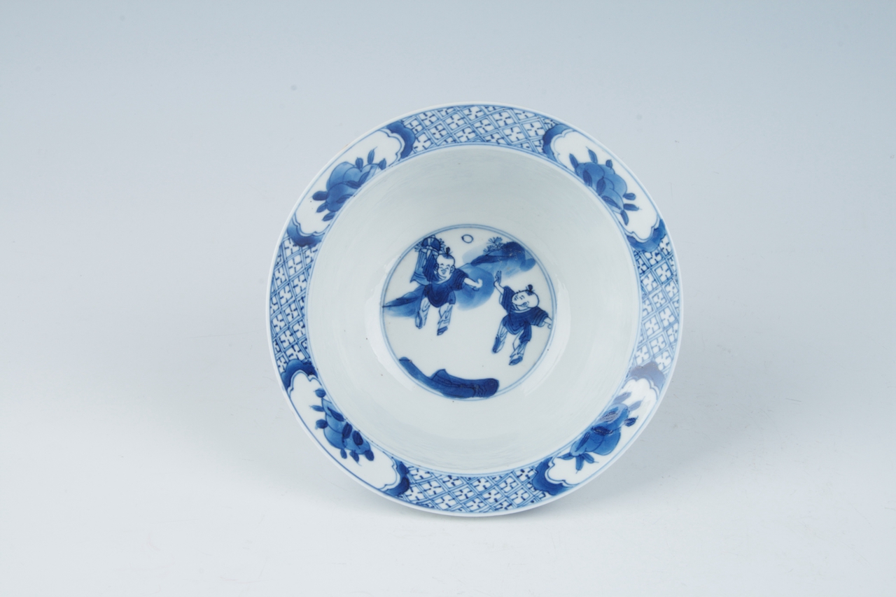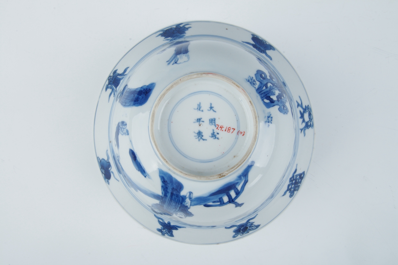 敞口,宽斜沿,深腹微垂,圈足。器通体以白釉青花为饰,胎体轻薄,青花发色艳丽。内宽沿锦地上有四处菱花形开光,内饰瑞果纹,碗内底心饰婴戏纹。外斜沿处饰八宝纹,腹部主题纹饰为“四妃十六子”,图中仕女身材修长,姿态飘逸,儿童娇憨可爱。圈足双圈内有“大明成化年制”六字双行楷书寄托款。