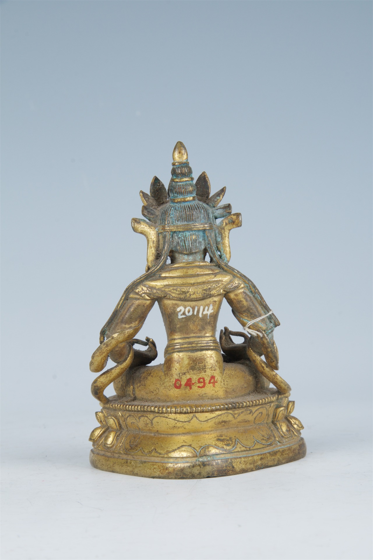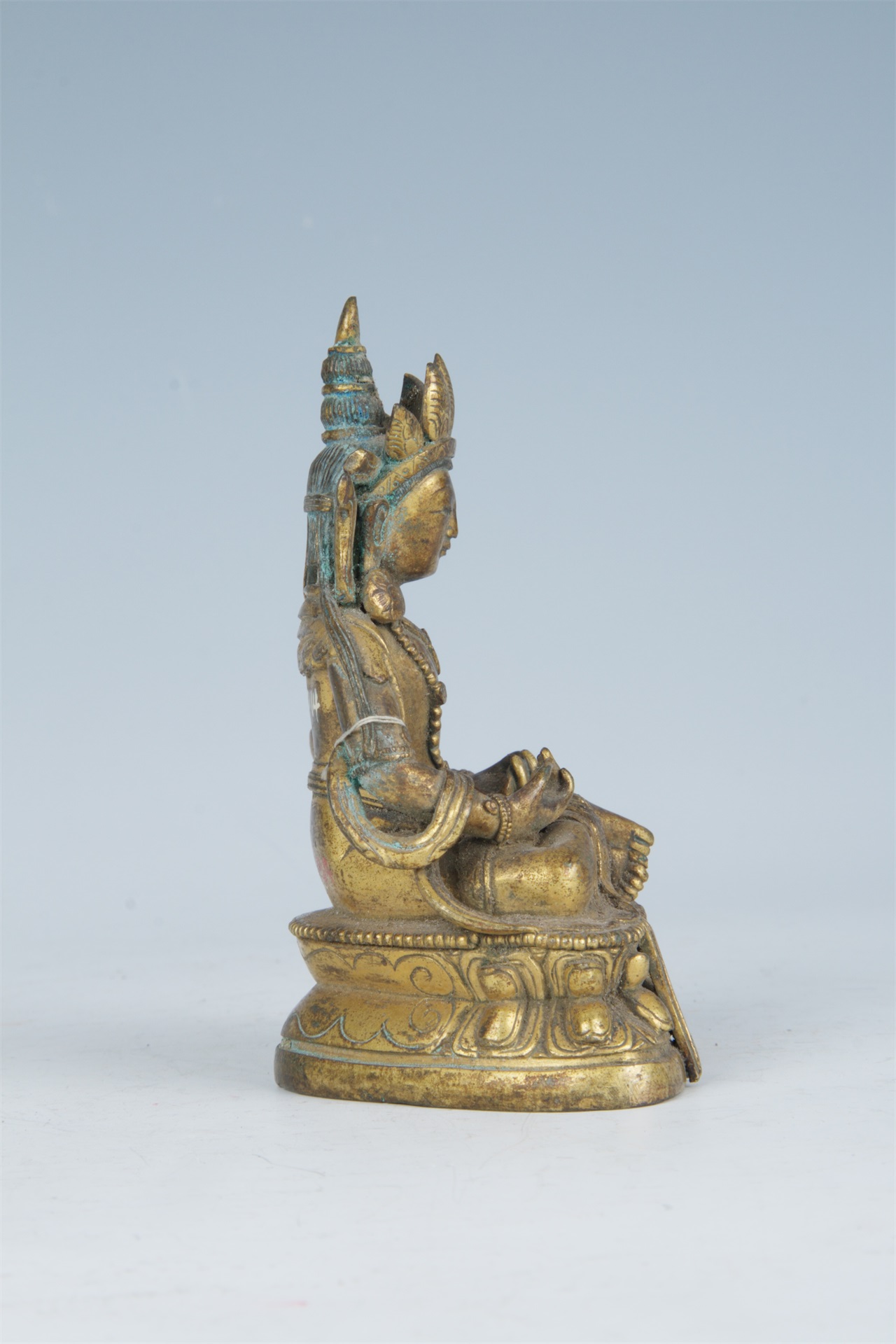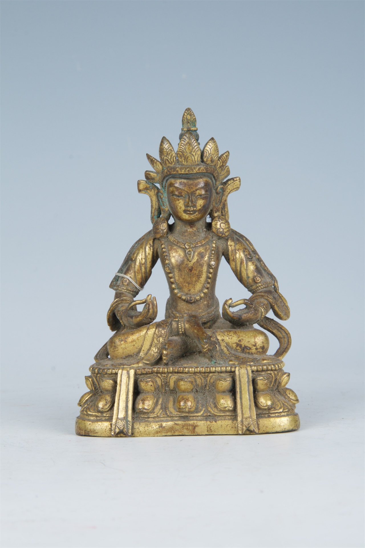 头戴五叶高宝冠,双耳垂长,佩耳珰,耳后各有一绺紺发披落于手臂。身形修长,戴项圈,配腕钏,肩披天衣,裙边錾刻卷叶莲花纹带。双手置于腿上,施说法印。双腿跣足盘坐于莲花台座上,莲台上边沿饰一圈联珠纹。通体鎏金。