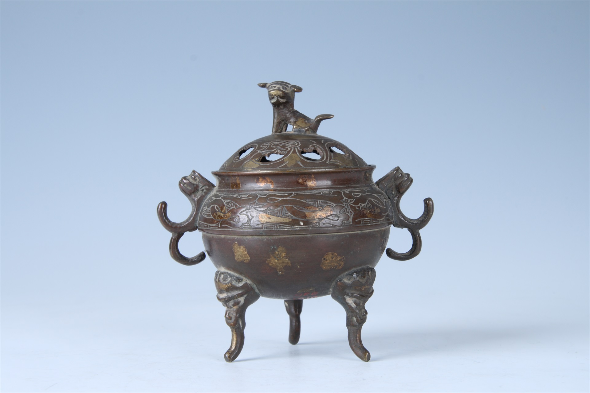 此器由盖身两部分组成,子母口,短颈,球形腹,腹底承三只兽面长足,足外撇,肩部与腹部饰对称双兽耳,肩部饰有一周变形夔龙纹,盖上饰一兽钮,盖面饰镂空变形夔龙纹,盖面与腹身均有洒金装饰。炉底刻有“宣德年制”四字篆书款。