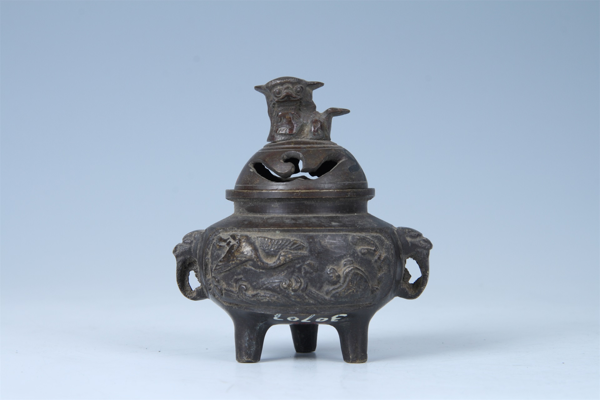 圆口平唇,短颈,扁鼓腹,腹底承三只短柱形足。炉身两侧对称饰双兽面环耳,腹两面饰开光,内刻云鹤海波纹。狮钮盖,盖面有镂空“山”形纹。