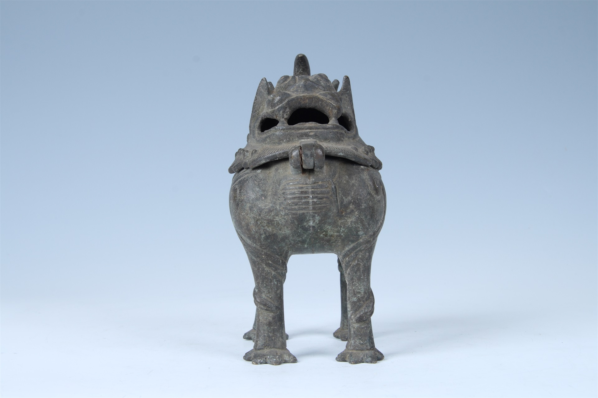 整器为一只站姿獬豸,独角,兽蹄,昂首,双目圆瞪,张口露齿。腹体作炉身,头部作盖,口部为熏口,腹身口沿下饰连钩卷云纹,腹身与腿部有枝蔓缠绕。