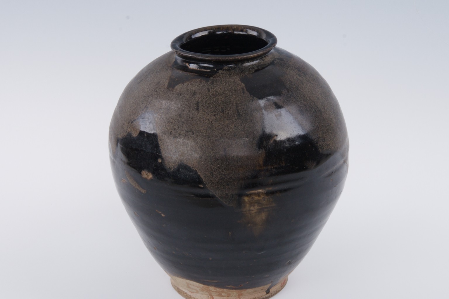 罐小口,口沿外卷,丰肩,鼓腹,下部渐收敛,平底。器身施以光亮的黑釉,肩部有一周灰釉彩斑装饰。在唐代,花釉瓷也独步一时,其中以河南的郏县窑、鲁山窑等为代表。其特点是在黑釉、黄釉、天蓝釉等地子上,饰以天蓝或月白色等色斑块,多少不等,或规整,或飘洒,深浅相应,互为衬托。这件黑釉灰斑纹罐,是唐代中期花釉瓷中的典型产品,造型古朴端庄,保存完好,颇为珍贵。