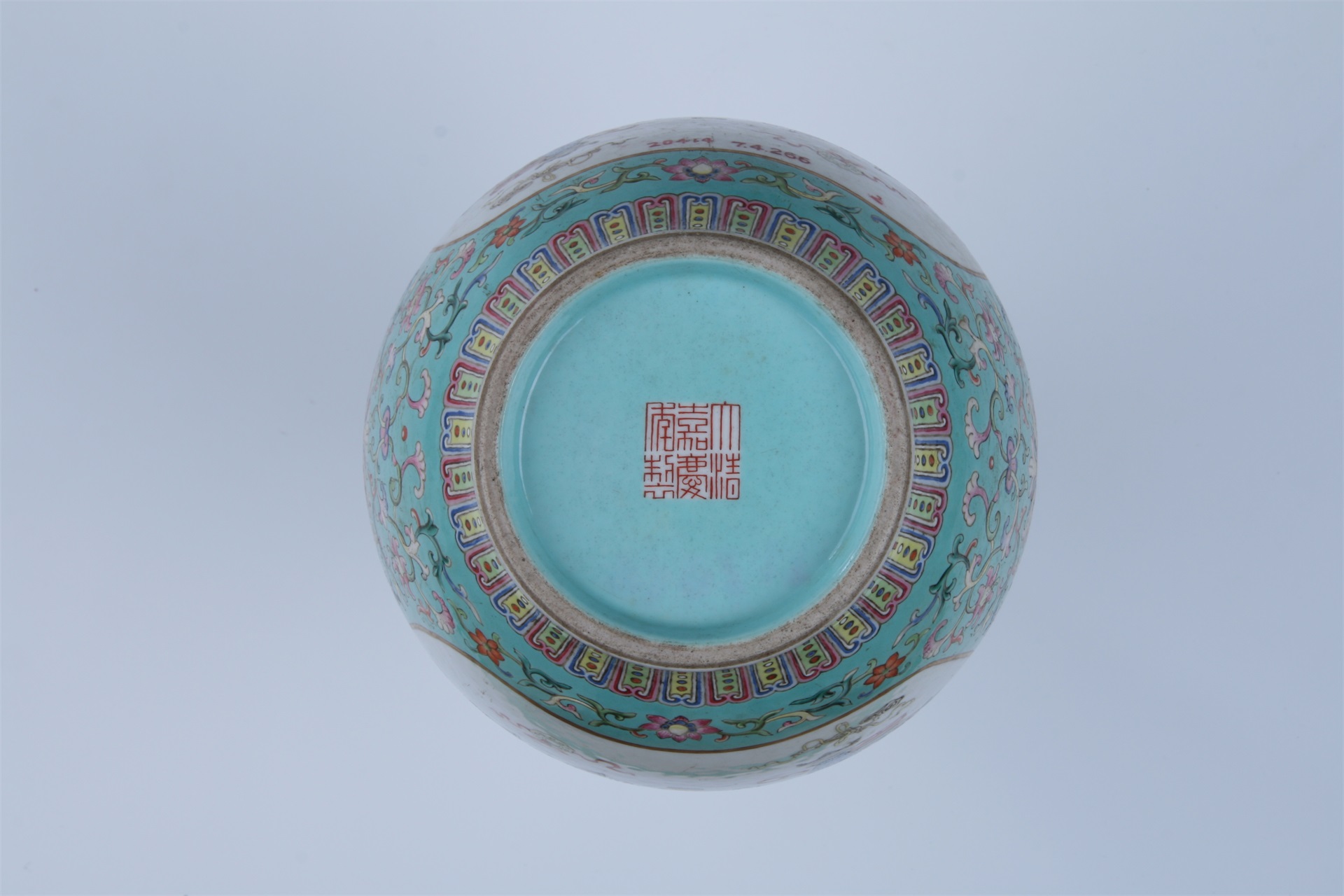 瓶撇口,长颈,颈上饰有矾红彩描金双兽耳,圈足。通体以绿色釉为地,其上绘有花卉纹饰。口沿下与肩部饰黄、蓝两色云头纹、红彩回纹各一周。足部饰变形五彩莲花瓣纹一周。腹部开光内饰“博古图”纹饰。圈足内以矾红彩署“大清嘉庆年制”篆书六字款。