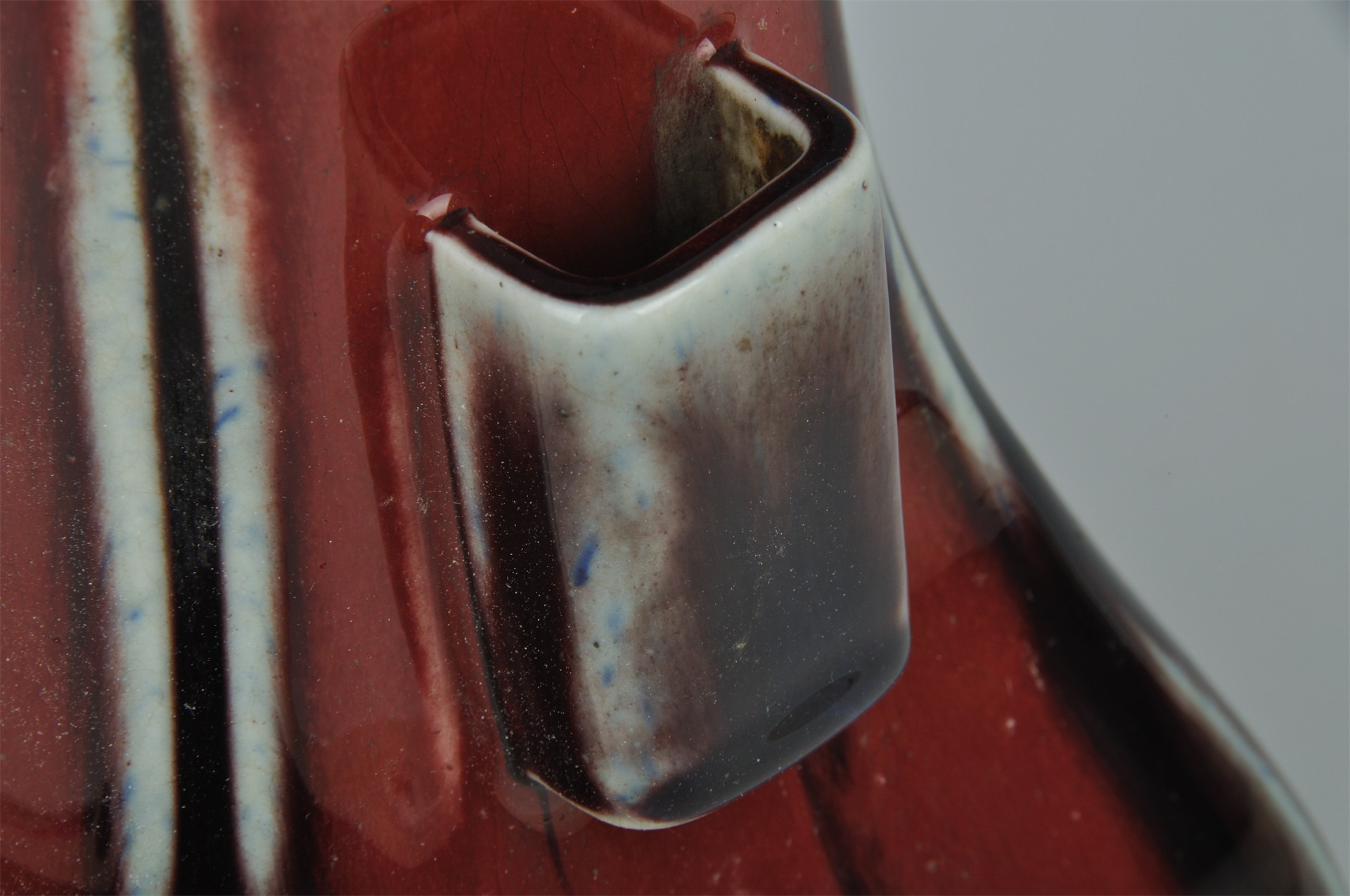 瓶口部呈四方倭角形,颈部饰有对称双贯耳,溜肩,扁圆腹,腹部中心有杏圆形凸起,长方形圈足,足内底心刻“大清光绪年制”双行六字楷书款。器通体施窑变釉,以鲜红色为基调,棱角处间有黑色或露出胎体的白色,釉面凝莹光亮,釉质肥润厚重,凸显出典型的晚清窑变釉风格。