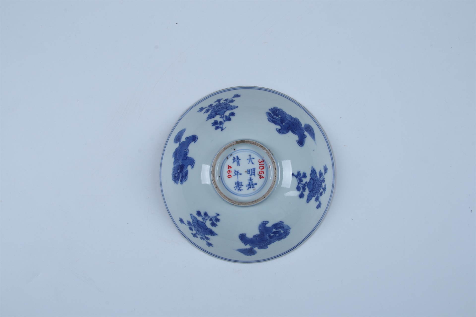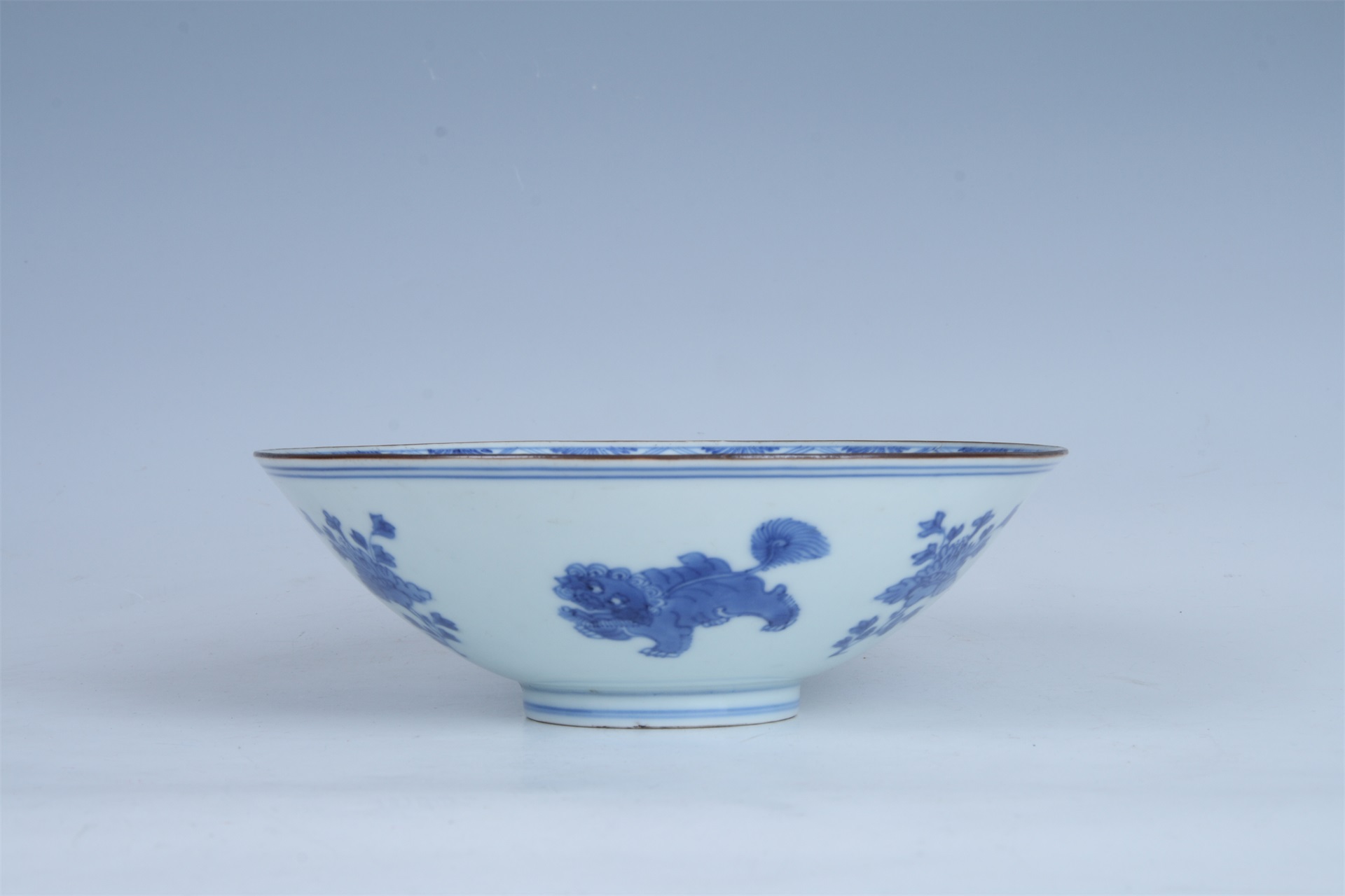 敞口,弧形腹,圈足,口沿呈酱色,通体施白釉青花,口沿与圈墙饰有双线弦纹,碗外壁饰有狮子、折枝花卉纹,碗内心双圈内绘折枝花卉纹,底足双圈内书有“大明嘉靖年制”楷书款。