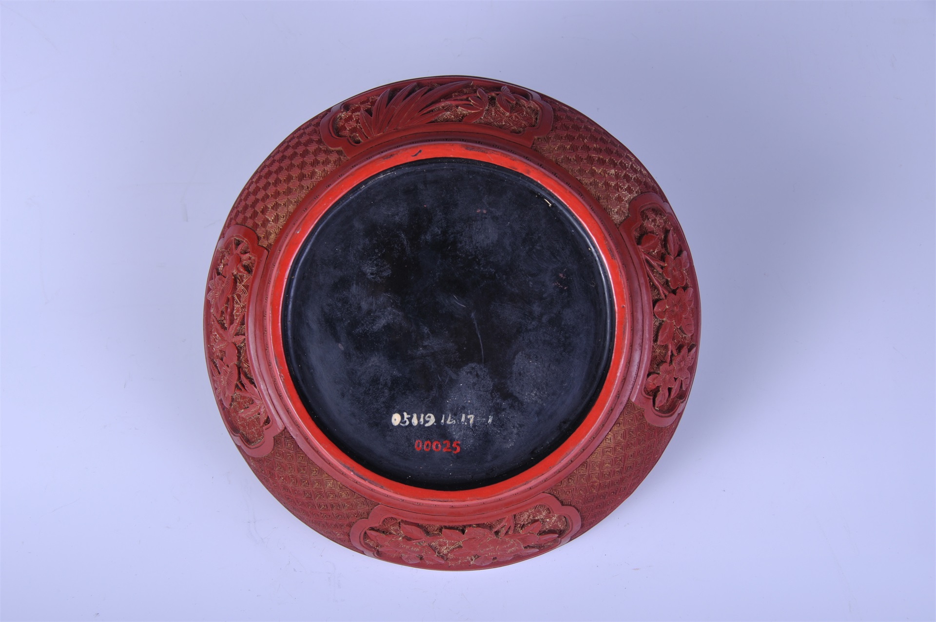 盖盒外髹红漆,盒内与外底髹黑漆。以回纹作锦地,盖面圆形开光内刻山水人物纹,盖和盒身外壁各有四组开光,开光内各刻折枝花卉一组,圈足上雕回纹一周。