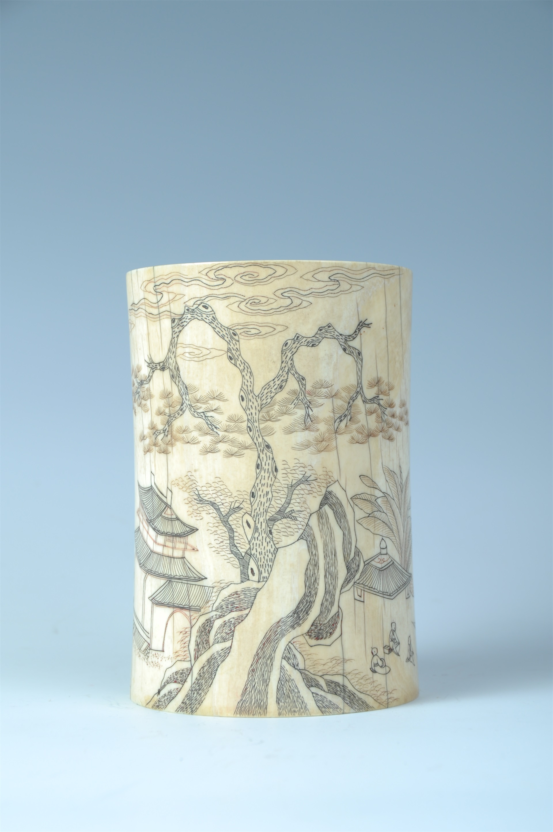 明象牙线刻山水人物笔筒