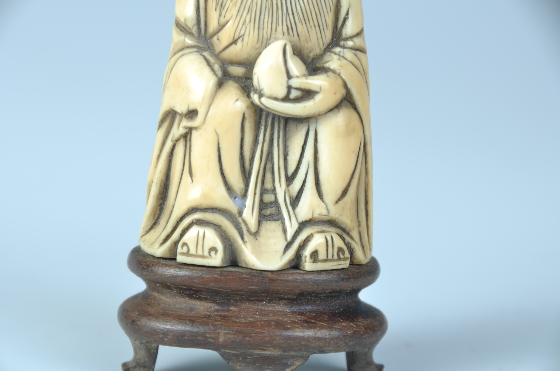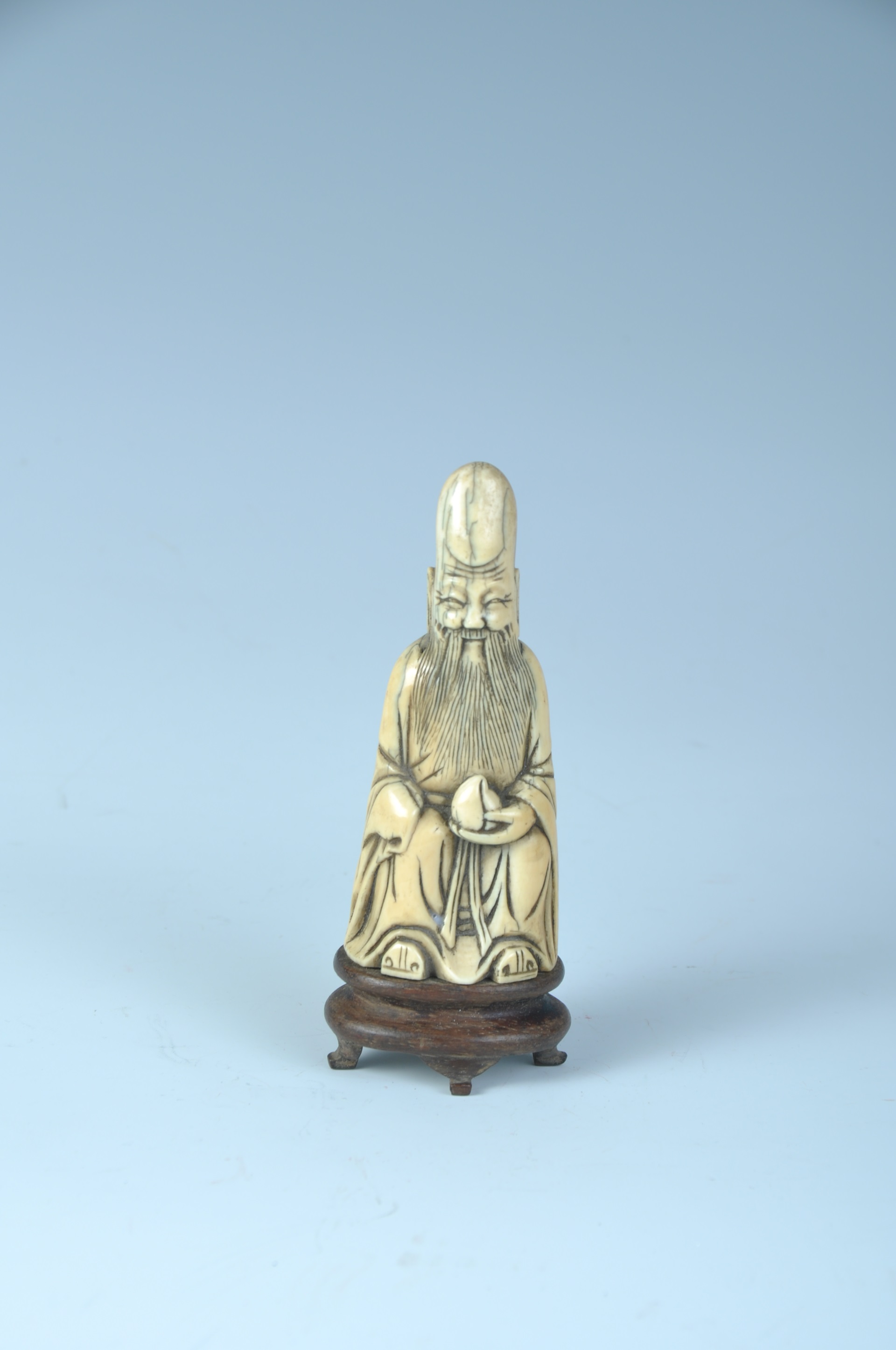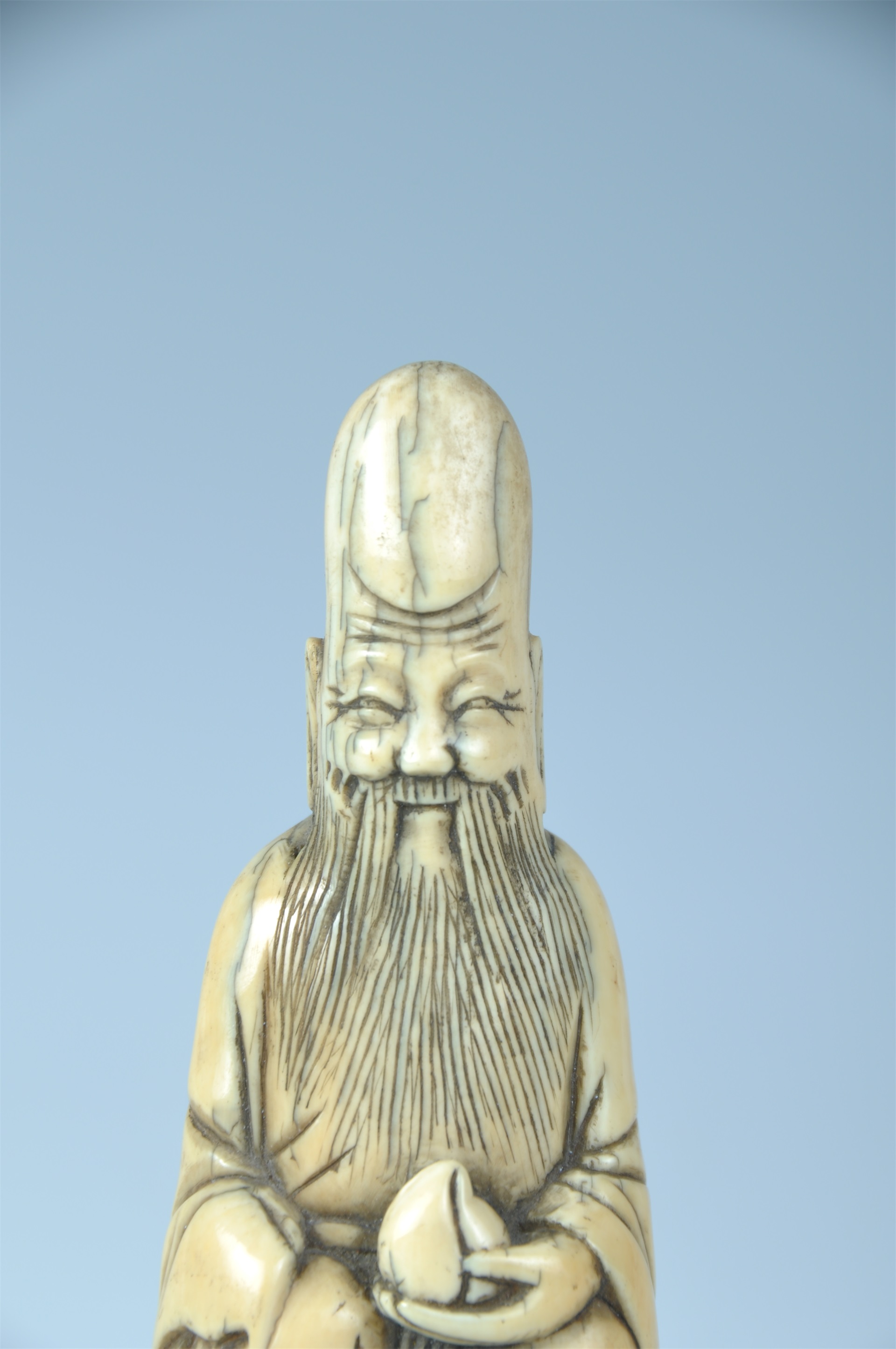 牙雕寿星呈坐姿,头顶高隆,脑后梳一髻,发带飘垂。额头上刻三道皱纹,喜笑颜开。长髯垂胸,宽袍束带,右手藏于袖内,左手握一寿桃,履头露出袍外。身下底座雕为木座之形。线条简练,人物造型夸张,具有典型的明代晚期牙雕人物风格。