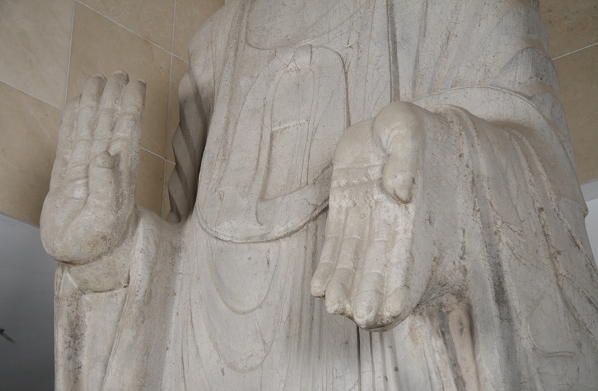 流传经历:这两尊石造像与另两尊北齐石菩萨造像原安放于山东临淄龙泉寺内,据《临淄县志》记载:“龙泉寺在龙池村西北淄水岸上,尚有石佛四,各高丈八尺”。“六朝石佛,在龙池村龙泉寺故址,佛高丈余,有荷兰人见之,谓形容与印度古石佛相同,真六朝物也,欲购之不可乃止。”1928年日军入侵山东时,日本商人曾两次预谋将佛像盗回日本,据1928年7月24日上海的《申报》报道说:“......临淄县龙池地方,有石佛两个(应是四个),成化碑一座,碎碑一方,在数年前曾有中国败类,拟将佛碑等以三万元之代价售予日本人,为地方人士闻知,出而干涉,故未成交,此次日本占据济南及胶济路沿线以迄青岛,龙池适在日本人所谓之二十里以内,某日人垂涎龙池之古佛碑等已久,乃于本月十五日,率人将佛碑一并劫取,运至淄河店车站,预备运往日本……。”而后,时正逢发生济南“五三”惨案之后,中国人民的反抗斗争风起云涌,日本侵略者迫于形势,未敢将这批文物盗走。直至1933年6月,山东省政府令公务处派人筹划起运至青岛四方公园。1940年前后,随着国民经济的迅速发展,四方机车车辆厂范围不断扩大,石像存放地带划归四方机厂。