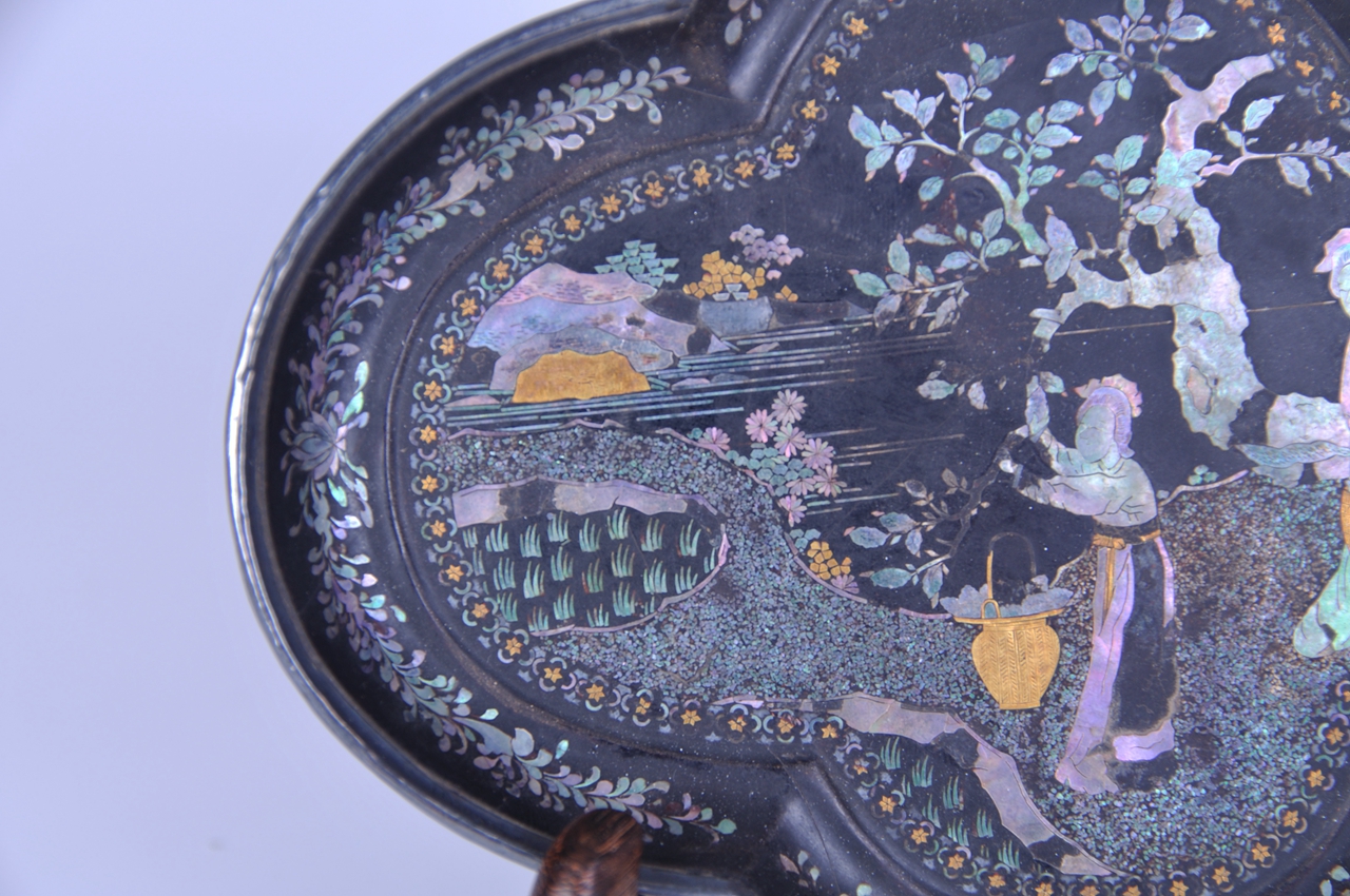 此盘为四瓣菱形。采用螺钿、金银钿嵌的装饰技法,内壁及盘面边缘随形饰两圈花卉纹,中部菱形开光内嵌饰仕女采桑图,远处山石错叠、波光如镜,近处绿禾摇曳、老树垂枝,制作精美。盘外底部以螺片嵌“爰求柔桑,春日迟亡”诗句。