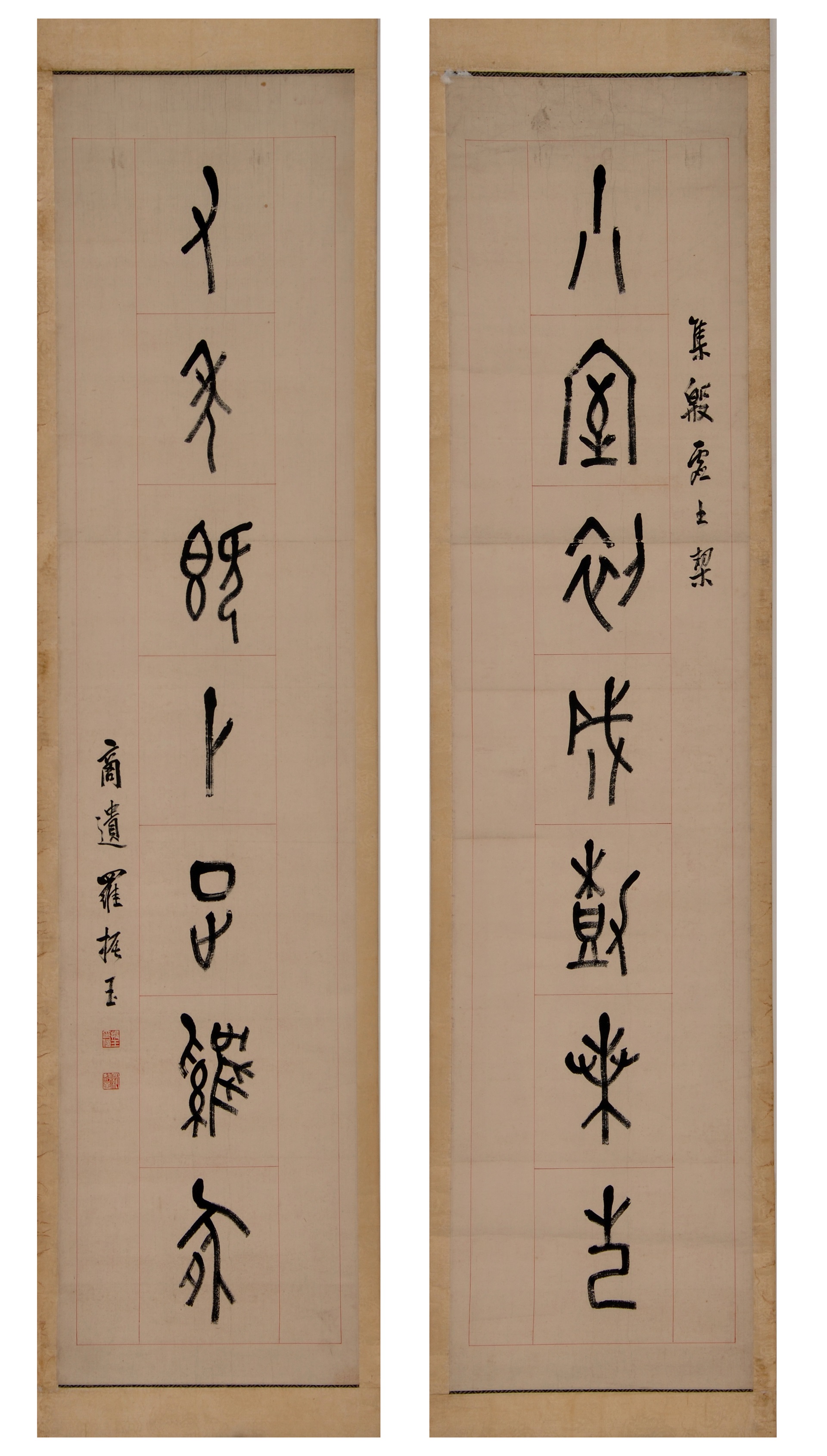 | 1830 | 清罗振玉纸本甲骨七言联 | 清 | 通长133 通宽31 | 查看 |