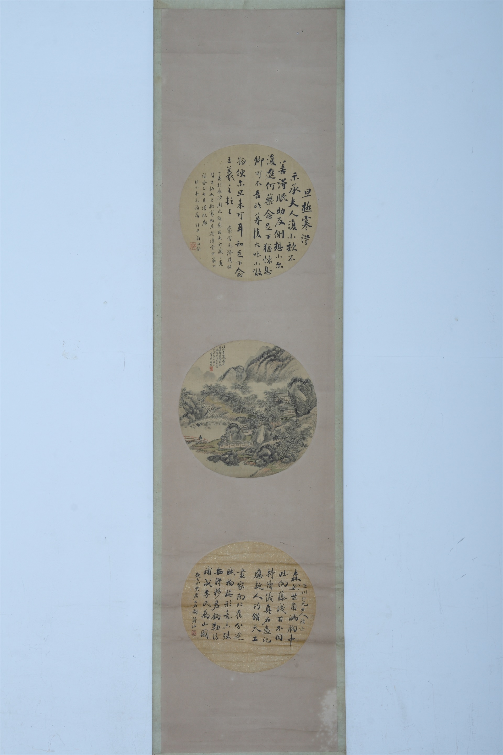 | 2383 | 清至民国姜筠、翁同禾绢本山水、行书纨扇面合装立轴 | 清至民国 | 通长26 通宽36 | 查看 |