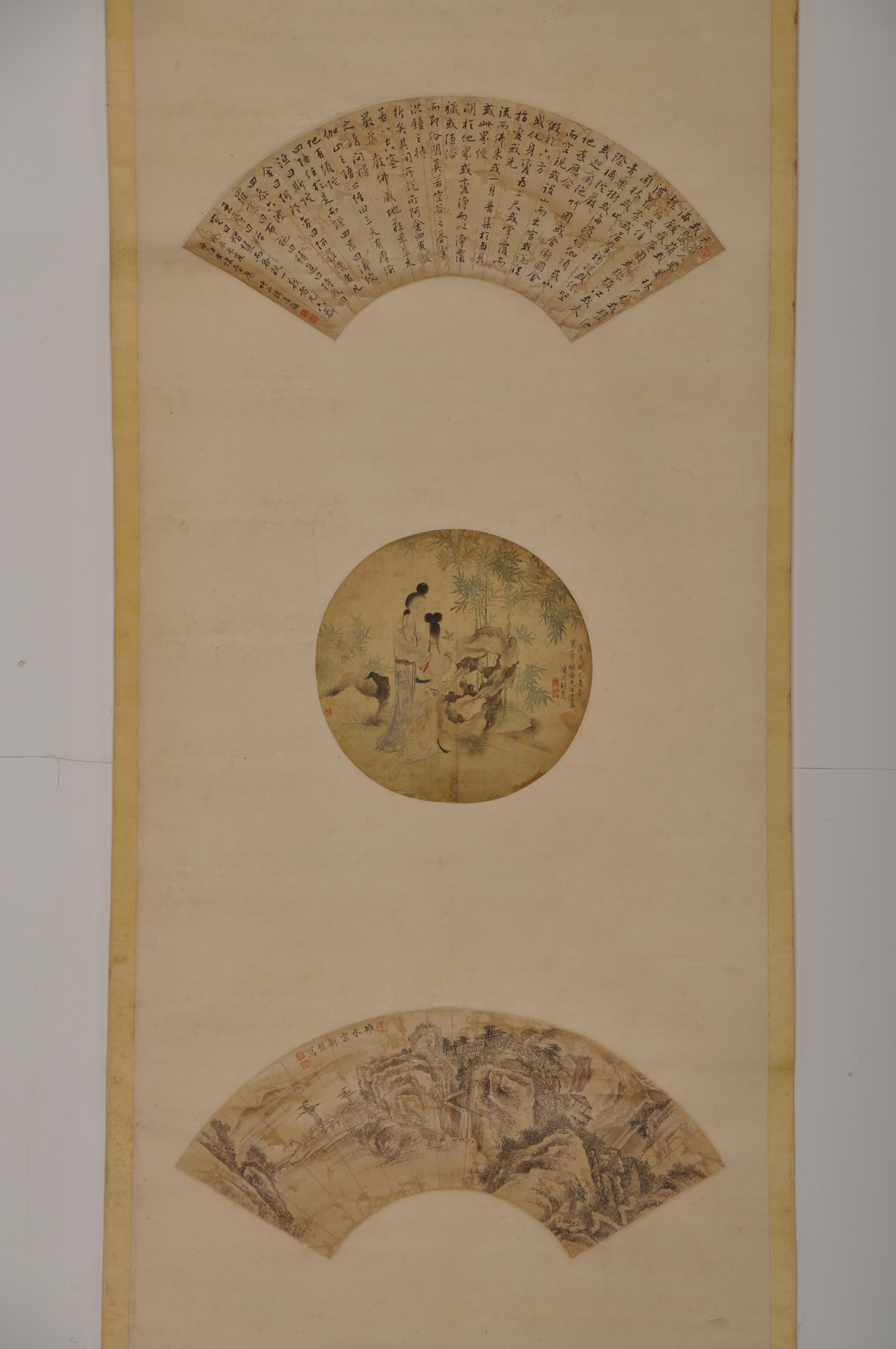 | 1049 | 清吴荣光纸本墨山水扇面、胡大文绢本团扇、钱清履纸本行书扇面合装立轴 | 清 | 通长53.3 通宽53.3 | 查看 |