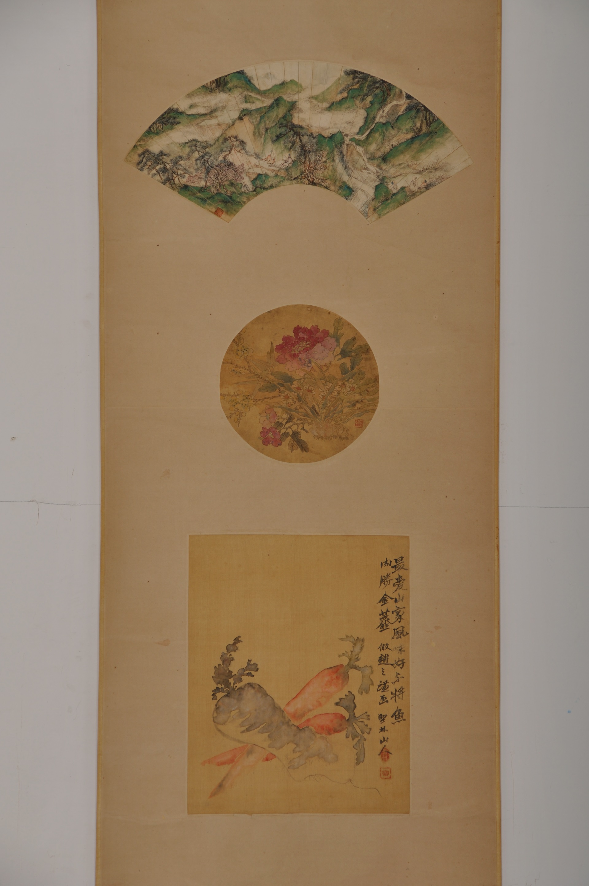 | 1053 | 清张鏐纸本青绿山水扇面、顾洛绢本设色花卉扇、圣林山人绢本设色蔬果合装立轴 | 清 | 通长51.5 通宽51.5 | 查看 |