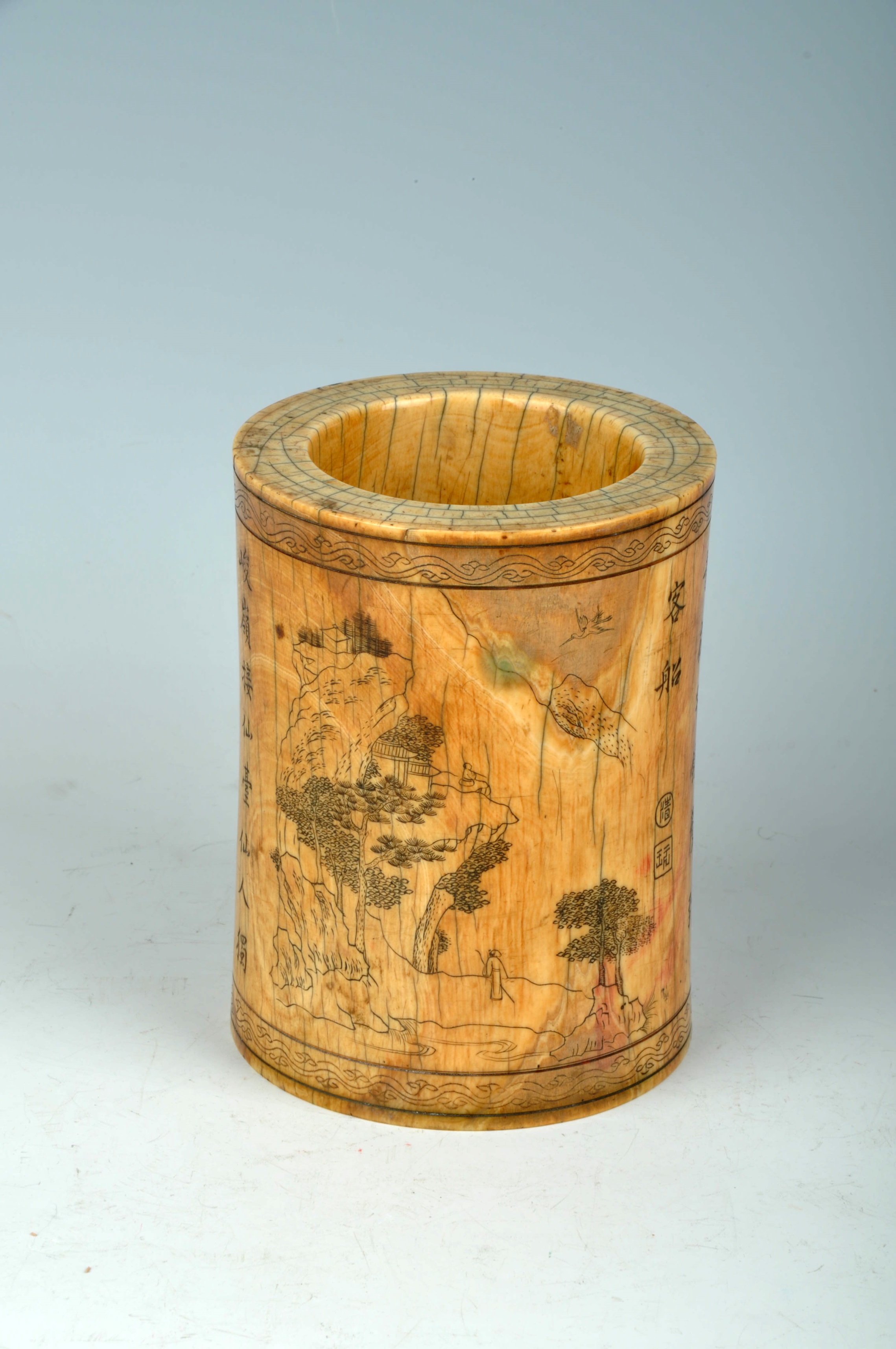6 明象牙线刻山水人物笔筒 通高13.2口径9厘米 查看
