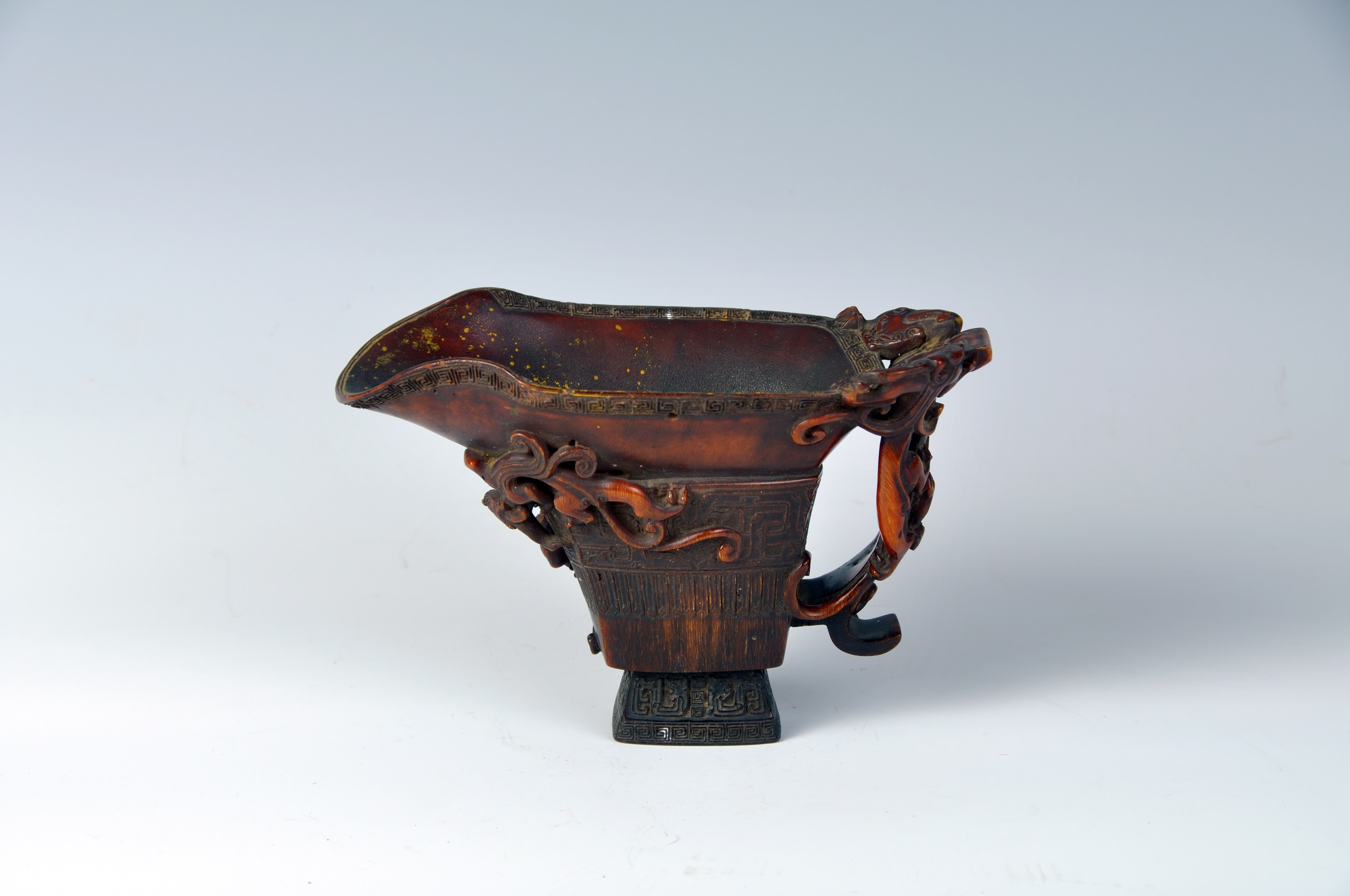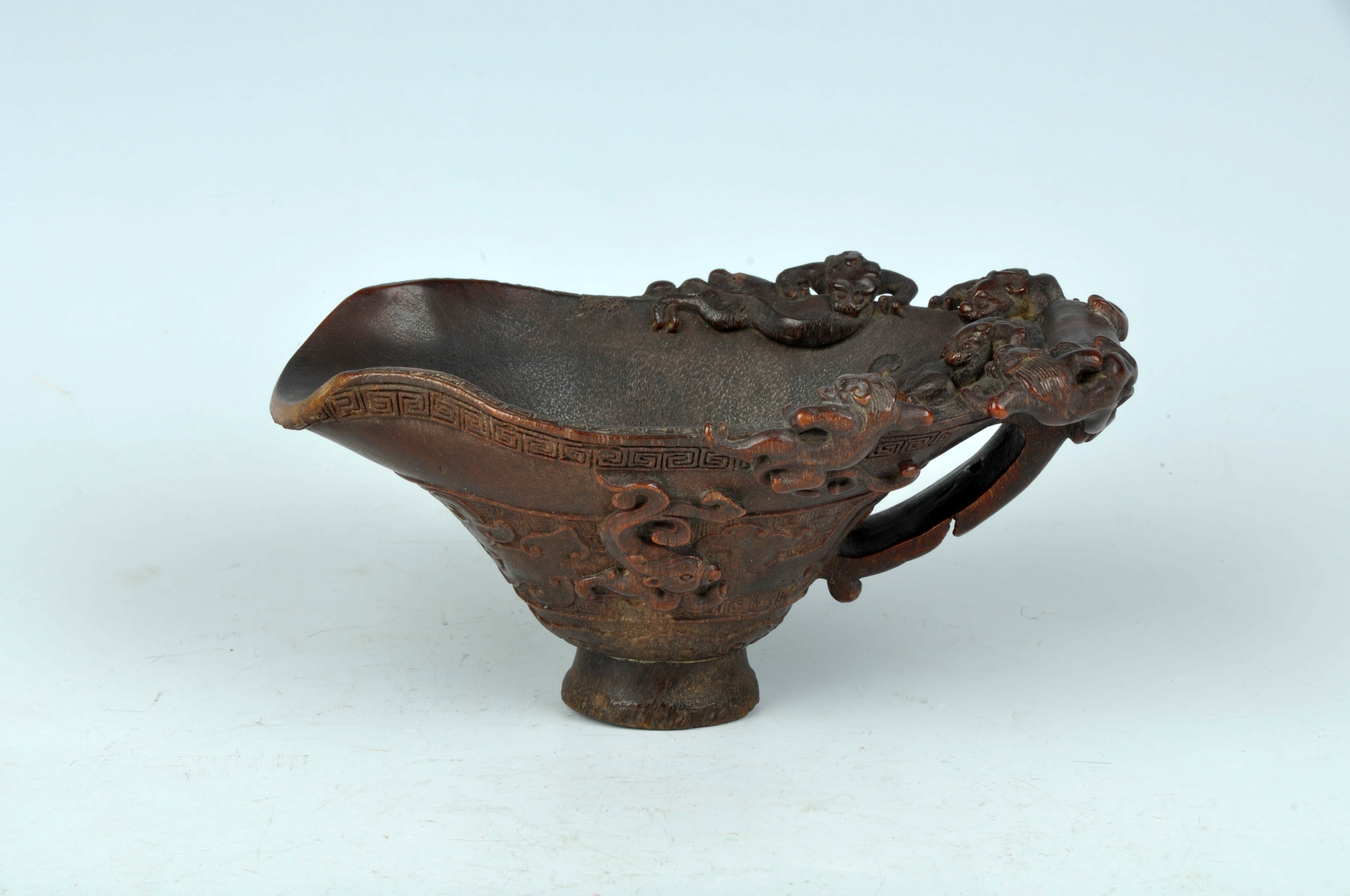 3 清犀角雕螭纹把杯 通高7.4口径15*9厘米 查看