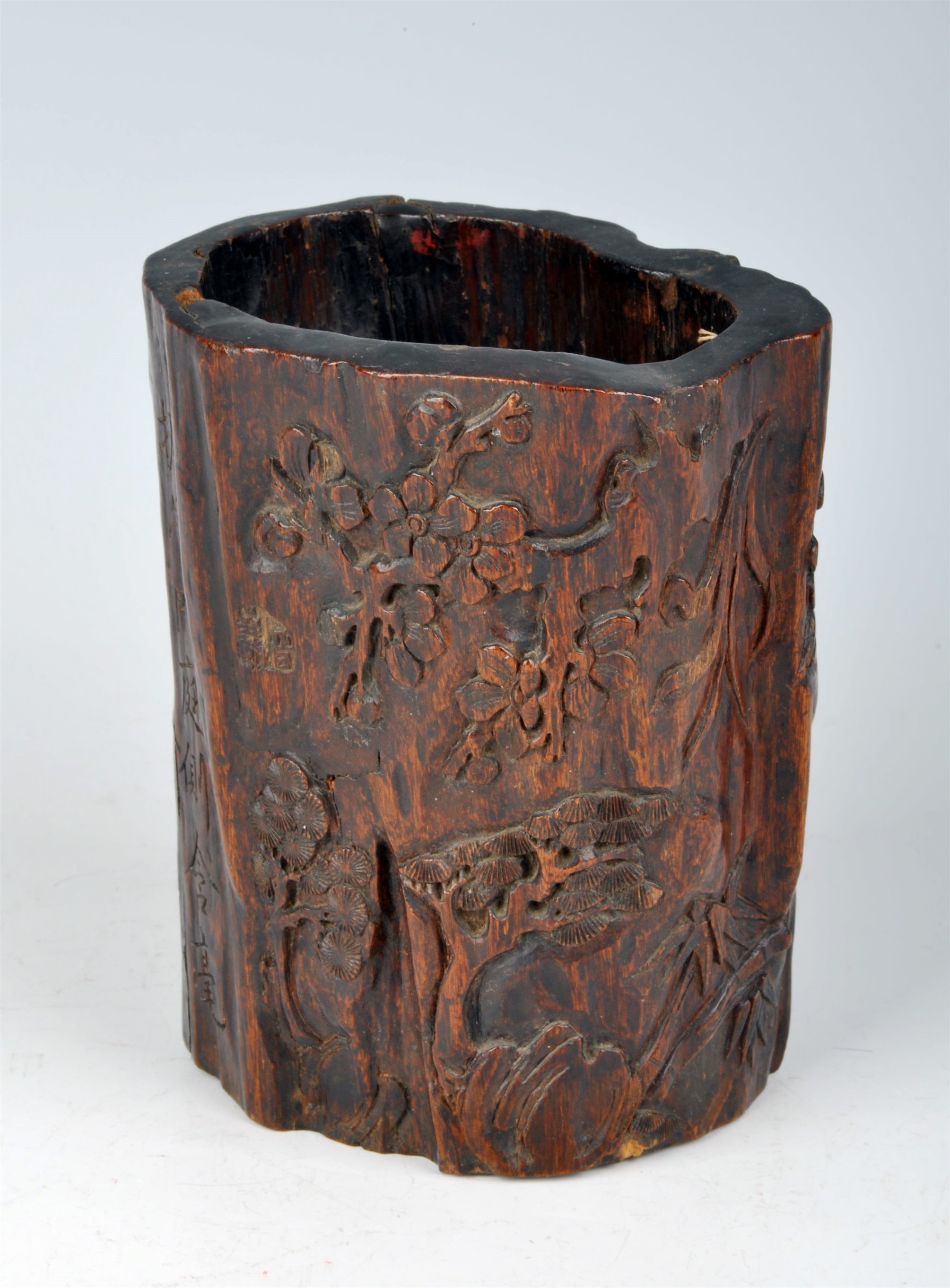 15 清同治沉香木雕岁寒三友笔筒 通高13.7径5.3 查看