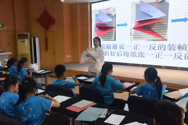 歌声过后是我们的汉服小姐姐——班主任王欣然老师闪亮登场的时间。王老师今天为大家带来的是书的故事——册页装帧制作体验。与第一天安静地听老师讲课不同,今天的内容不仅能听,还能动手操作。小营员们一下子便活跃起来,一个个认真地样子感觉比平时上课还要用功。裁一裁、粘一粘,不大一会儿,精美的册页在他们手中便宣告完成。
