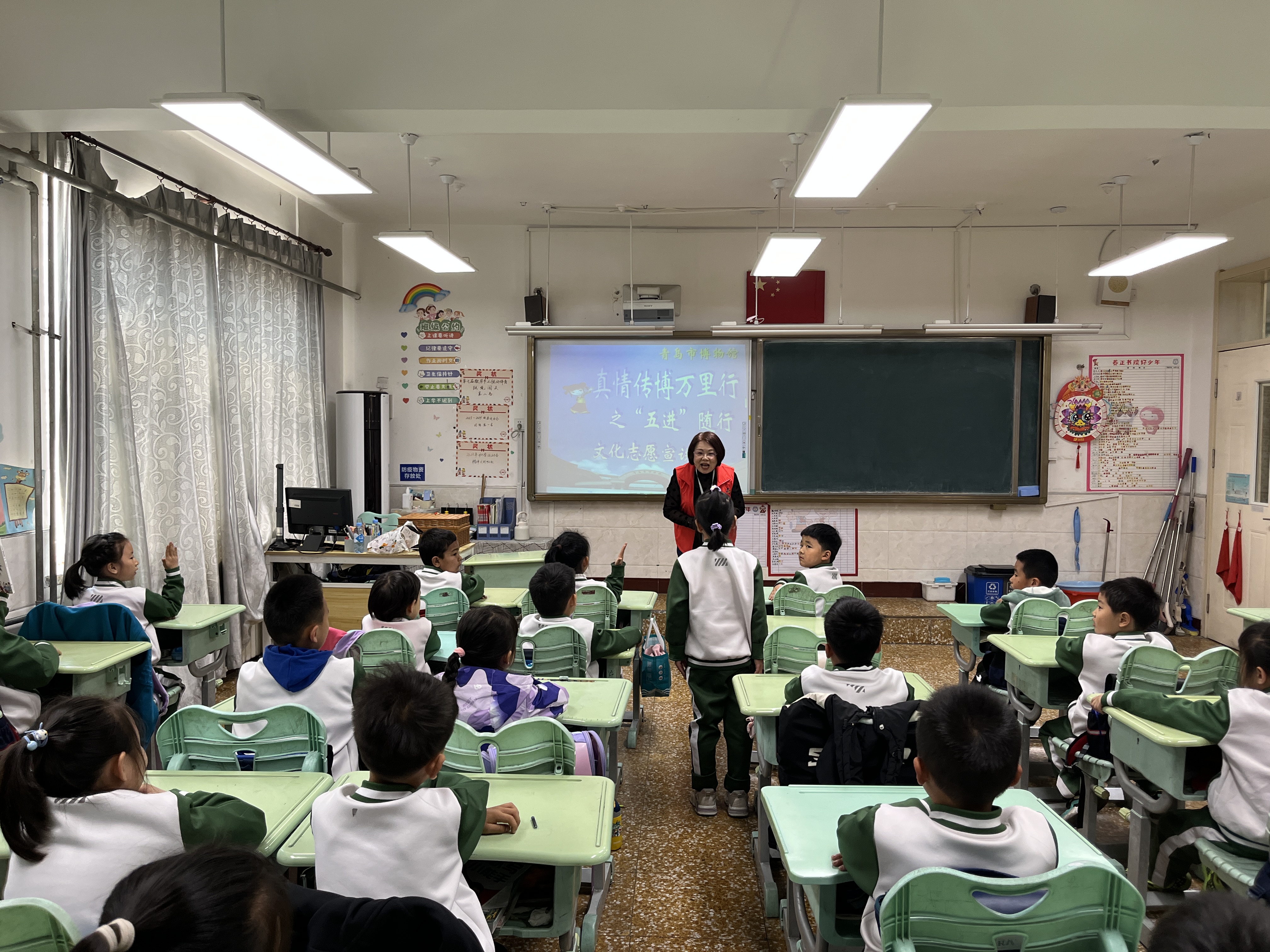 初冬季节, 文化五进志愿宣讲团将“文物里的金木水火土”文物知识讲座送进青岛市敦化路小学,为…